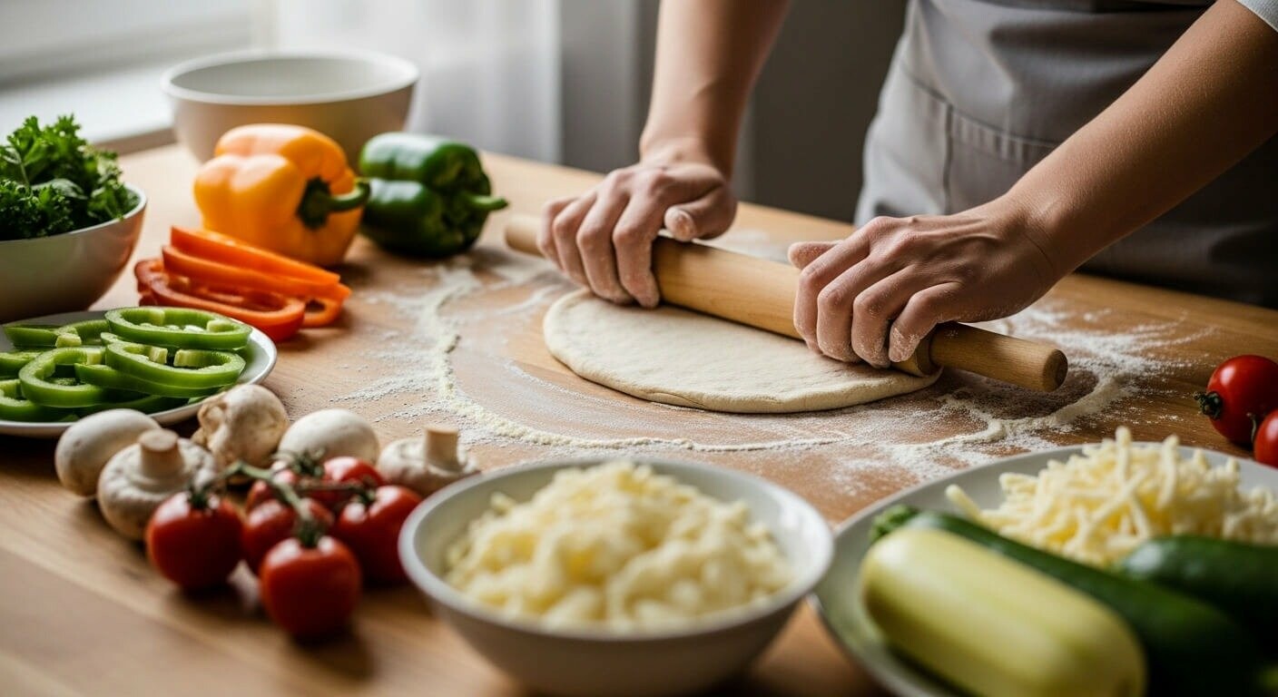 Приготування тіста звісно займає час, але воно того варте. Замішуєте, даєте підійти годину-дві, розкочуєте тонко, і основа готова. Корж має бути рівномірним, не надто товстим, щоб овочі та сир пропеклися як треба.